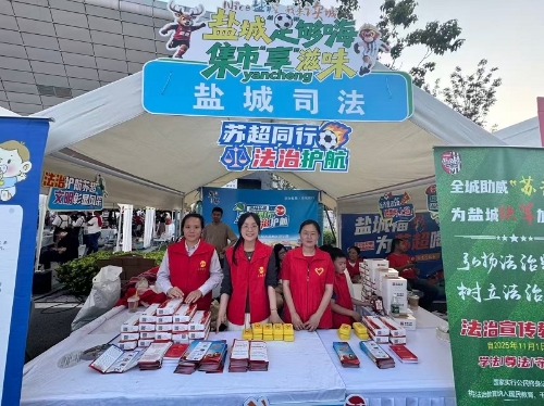 9月20日,江苏省城市足球联赛(“苏超”)第十二轮,盐城队VS连云港队,作为主场的盐城奥体中心体育场外集市上绵延数百米的文商旅体特色集市中,由盐城市盐都区司法局主办的“苏超同行 法治护航”的普法宣传摊位前游客争相驻足打卡,成为许多人逛集市的“特别收获”。